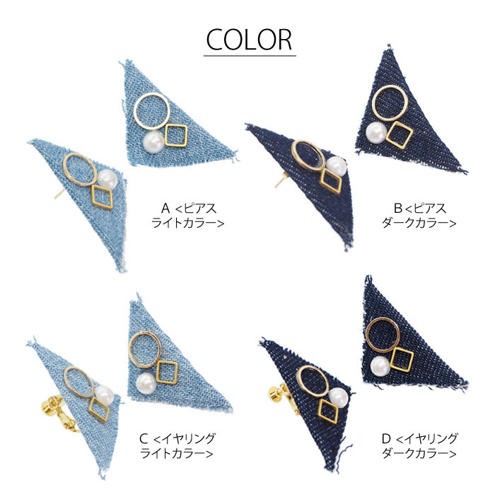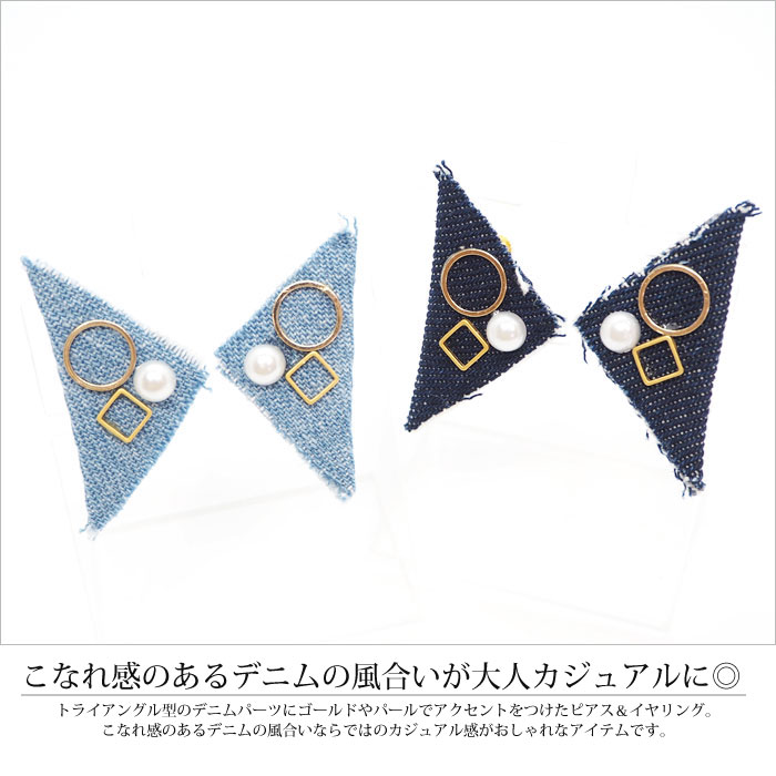 商品名 ピアス&イヤリング(デニムトライアングル) (pi-380-074) STAFFコメント ゴールドとパールがアクセント!デニム素材のピアスとイヤリングです。