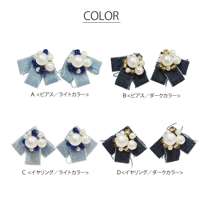 デザイン A<ピアス/ライトカラー> B<ピアス/ダークカラー>・C<イヤリング/ライトカラー>・D<イヤリング/ダークカラー> サイズ モチーフ部:約2.5×3cm 入数 1ペア 材質 真鍮・アクリル・ABS樹脂・コットン・ガラス 原産国 日本 知っておいて頂きたいこと ▼ハンドメイドのため、リボンの長さ・形に個体差がある場合がございますが通常品として販売します。